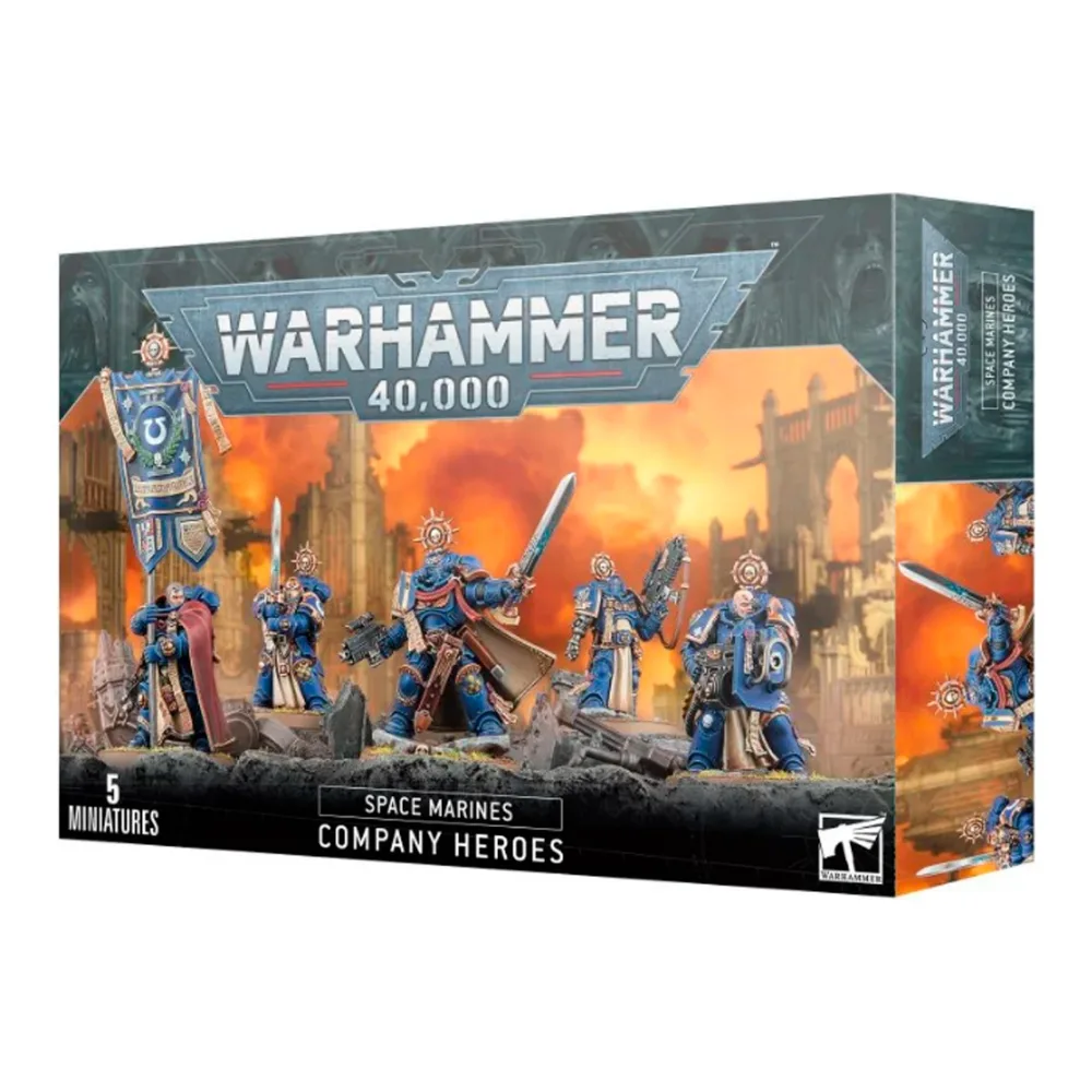 Este kit de plástico de varias piezas permite montar un Capitán de los Marines Espaciales y cuatro Héroes de Compañía que lo acompañarán en batalla. Puedes armar al Capitán con un bólter artesanal, una pistola de plasma o una pistola neovolkite en una mano, y un puño de energía o una espada de energía en la otra. Su séquito incluye un Campeón armado con una espada de energía a dos manos, un Anciano que porta en alto un estandarte ornamentado y dos Veteranos con armas de fuego artesanales (uno con un rifle bólter y el otro con un bólter pesado).
