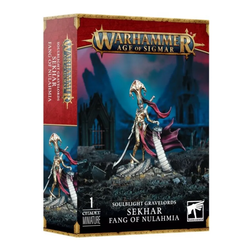 Warhammer Age of Sigmar Soulblight Gravelords Sekhar Fang of Nulahmia representa a una de las más letales y bellas hijas de Neferata, maestra de la manipulación y la guerra. Armada con su látigo serpentino y una daga ceremonial, Sekhar combina el poder marcial con la astucia vampírica, inspirando a las huestes no muertas y desmoralizando a sus adversarios.